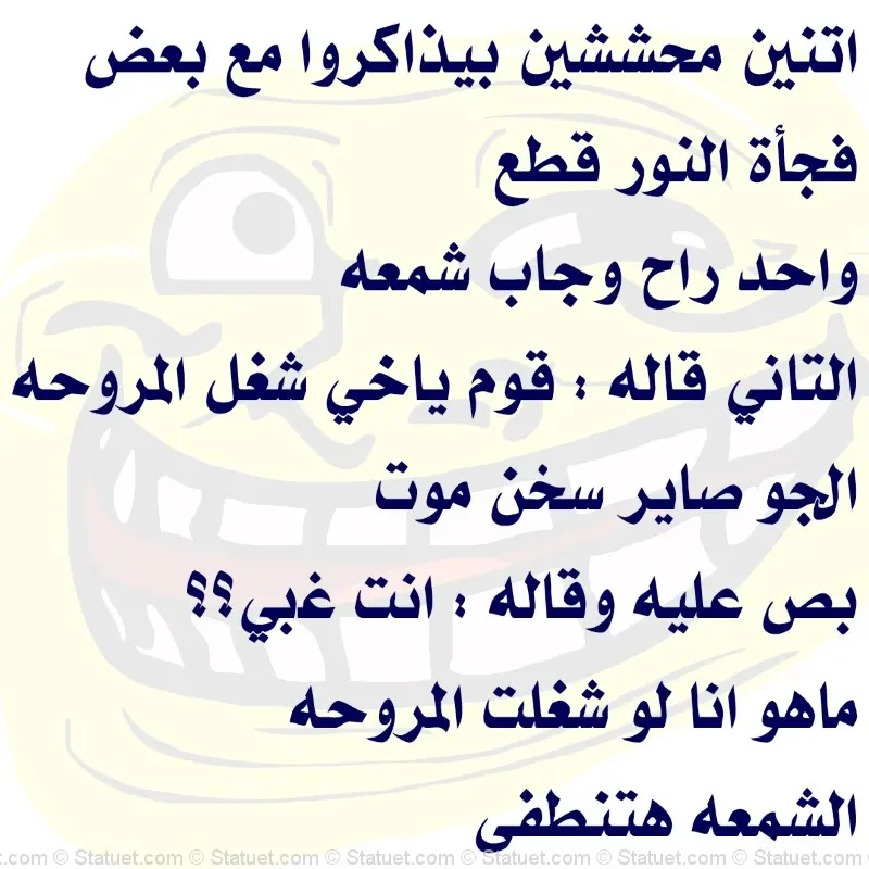• احد ربنا فاتحها بوجه وساكن في الطابق الخامس وبعد ما نزل الصبح افتكر انه نسى نظارة الشمس والمنديل فنادى على زوجته وقالها ارمي النظارة والمنديل فرمت زوجته النظارة فانكسرت فقال لها خلي المنديل انا طالع اخذه .