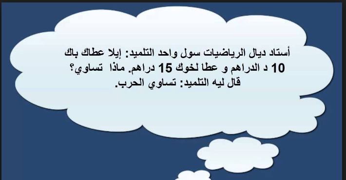 - هادي واحد المرا كبيرة كتقرا ف محاربة الامية لقاها ولدها كتاكل فحبوب منع الحمل قال ليها ولدها اش كديري ا الوالدة قالت ليه وا غير سكت اولدي راه قال لينا الاستاذ اللي ما جاش حافظ غادي يحمّلو